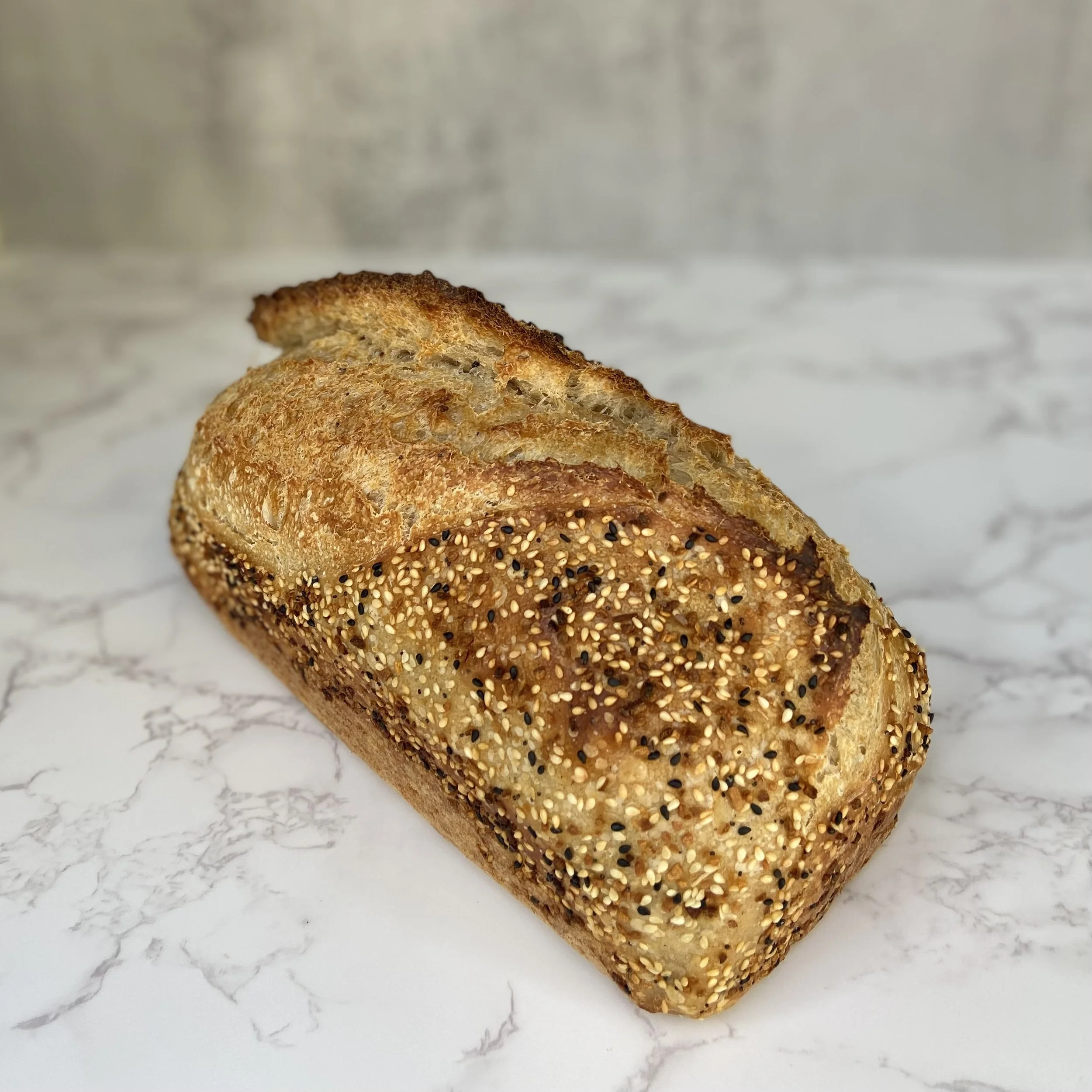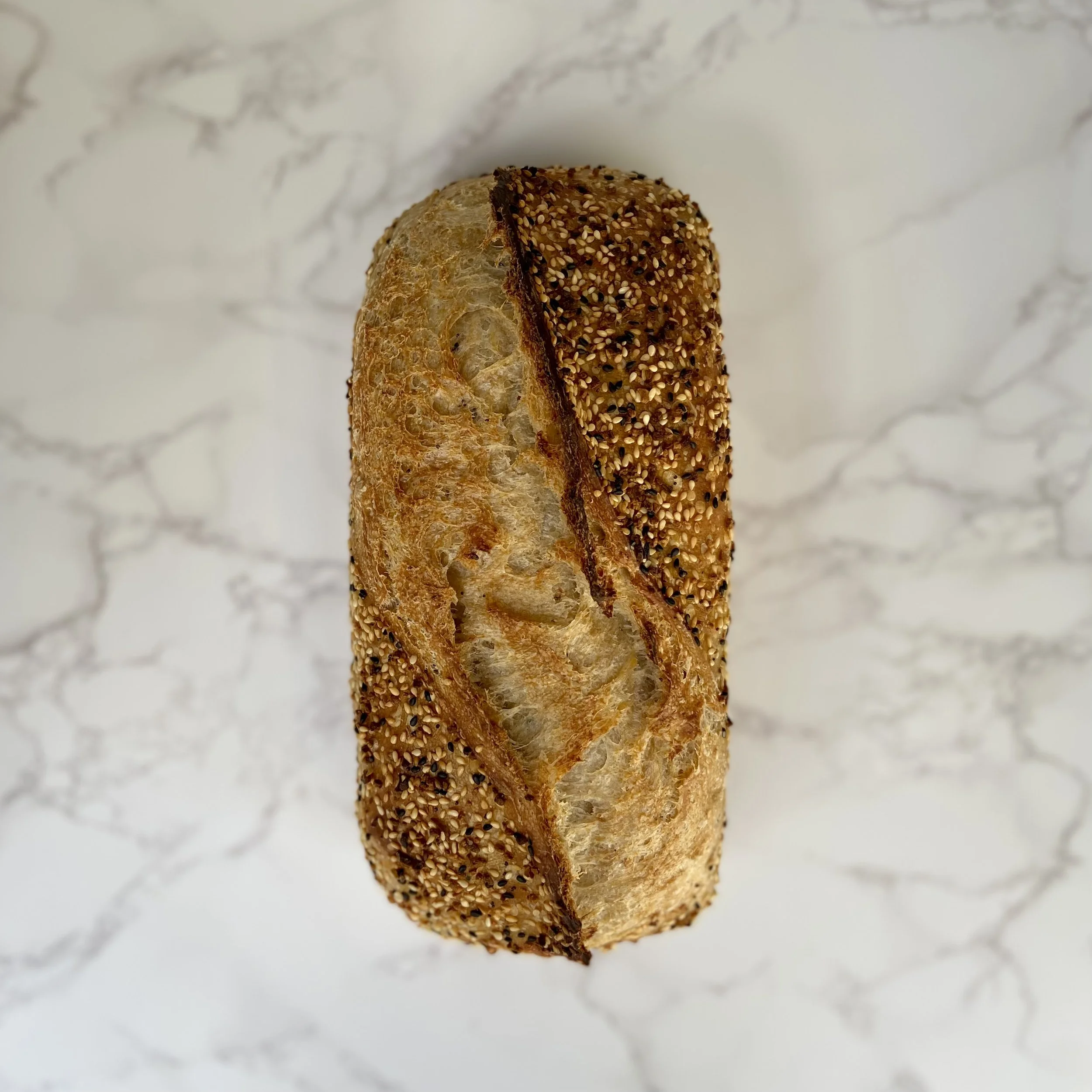 Calling all bagel lovers! Enjoy a crisp, airy sourdough loaf with everything; sesame, poppy, garlic, and onion throughout the dough and sprinkled on top.